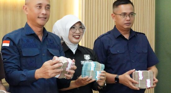 Kepala Seksi Penerangan dan Hukum Kejaksaan Tinggi Sumatera Selatan Vanny Julia Sari Eka SH MH dan dua penyidik memperlihatkan fisik uang kerugian